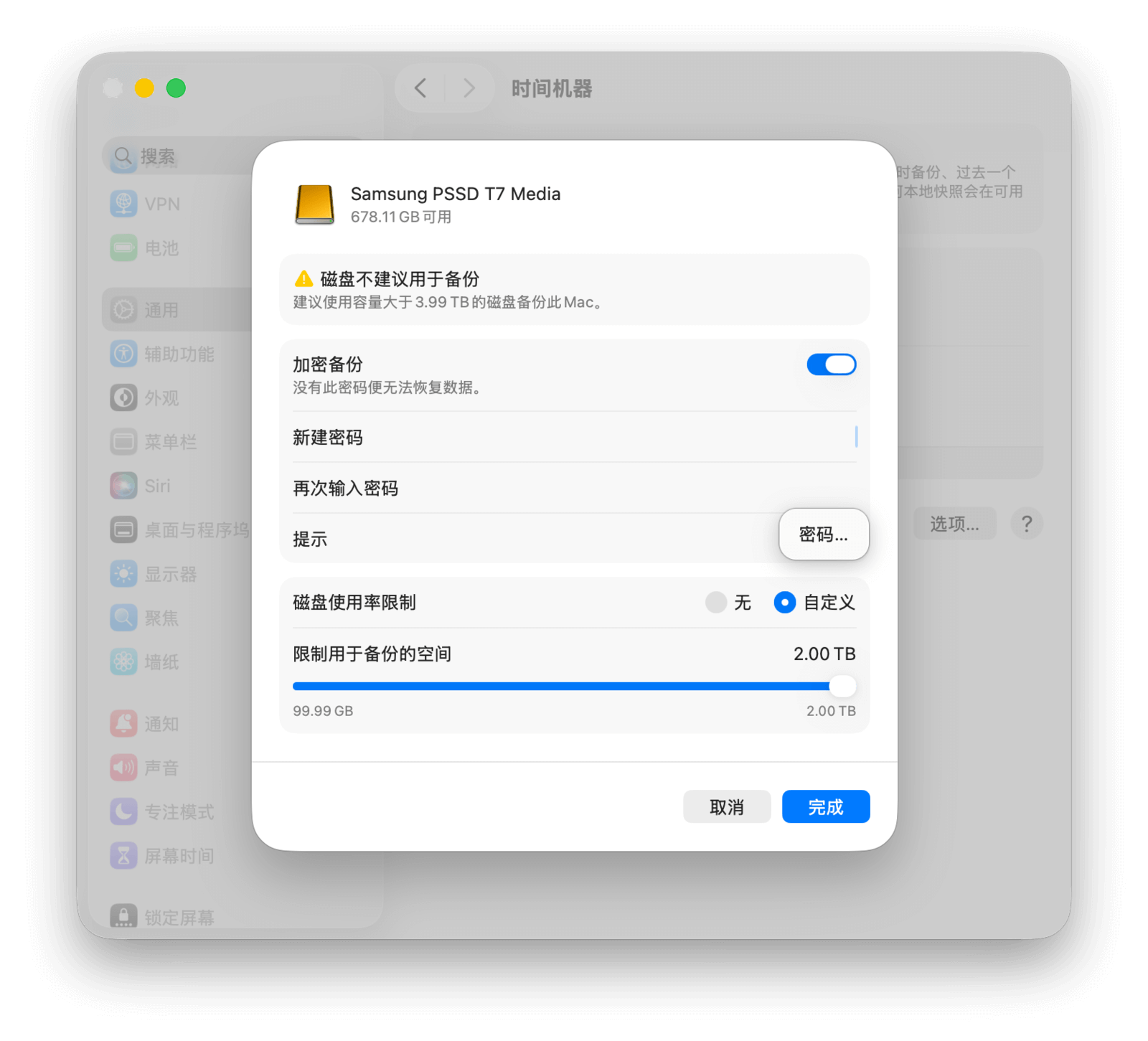 如果希望加密备份,可以在选中磁盘后,勾选下方的「加密备份」并设置密码。这个密码一旦忘记将无法恢复,因此请务必妥善保管。