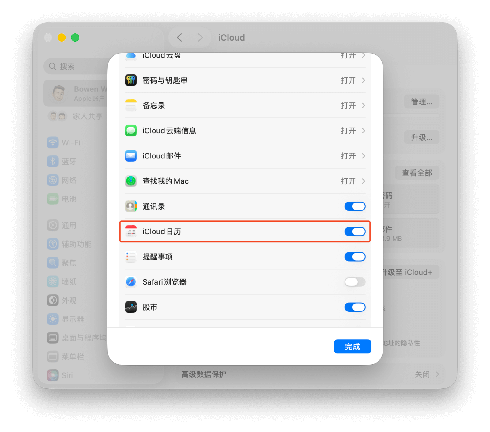 「日历」是 macOS 的内置应用,开箱即用。如果你有多台苹果设备,可以通过 iCloud 在设备间同步日程。只需前往「系统设置 → Apple ID → iCloud」,确保「日历」选项已开启。