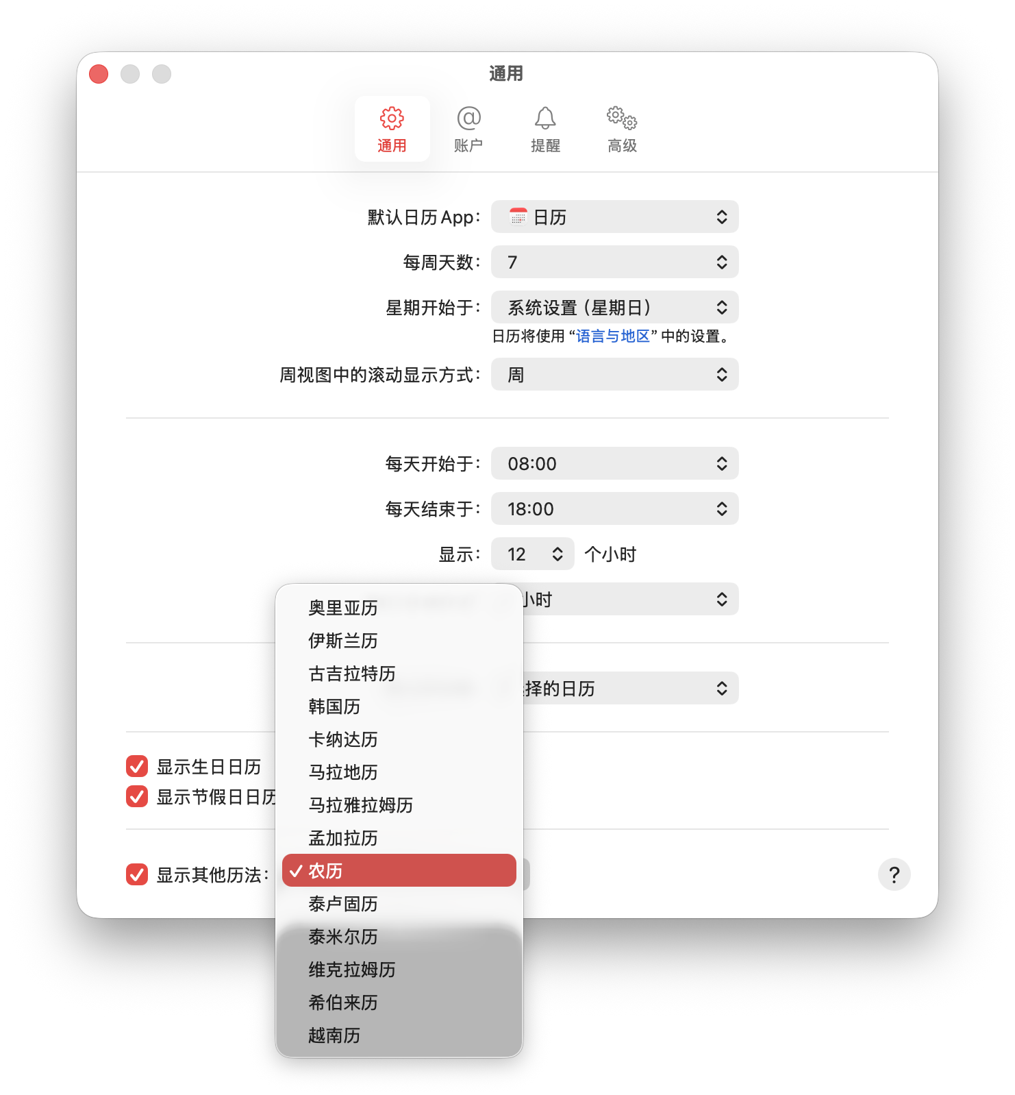 「显示其他历法」功能可以让你在公历之外,额外显示农历、希伯来历或伊斯兰历。如果你想同时查看公历和农历,勾选「农历」即可。
