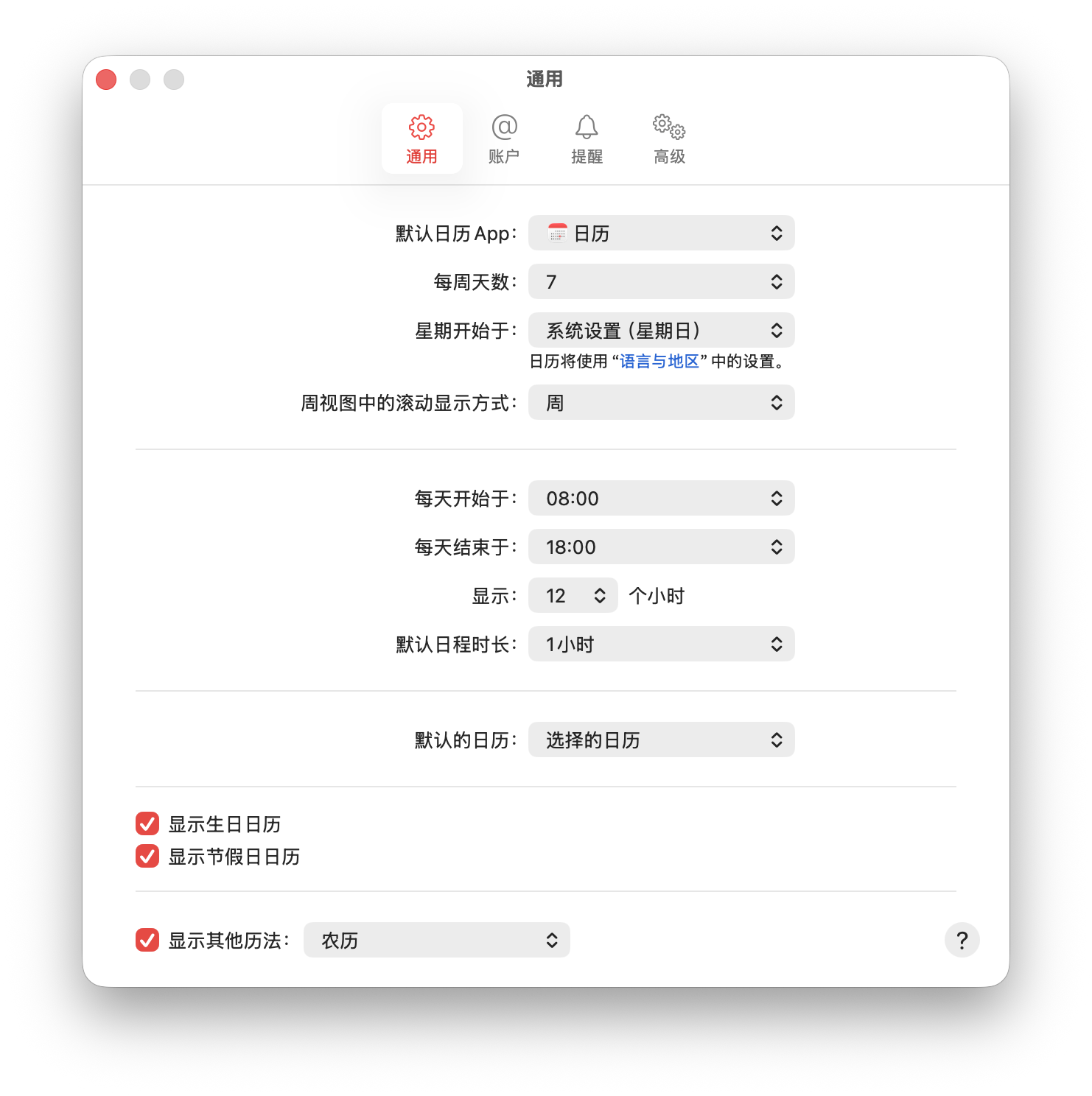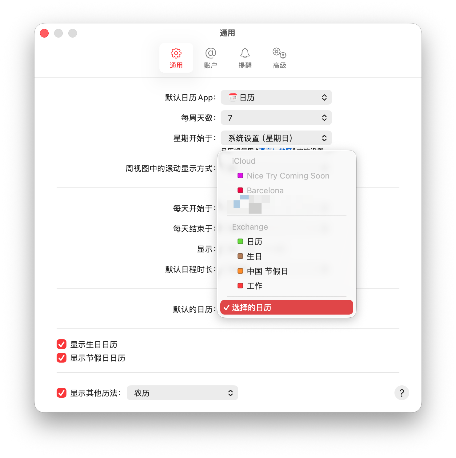 在「默认日历」处,你可以设定新建日程时默认使用的日历账户。