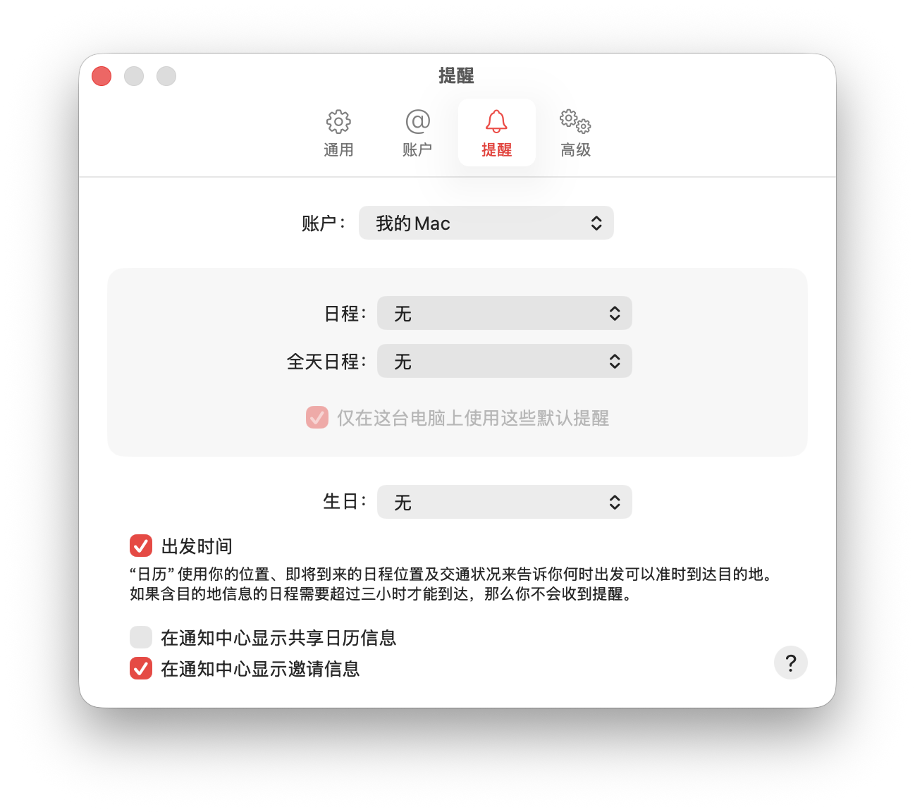 在「提醒」选项卡中,你可以为普通日程和全天日程分别设置默认的提醒时间。
