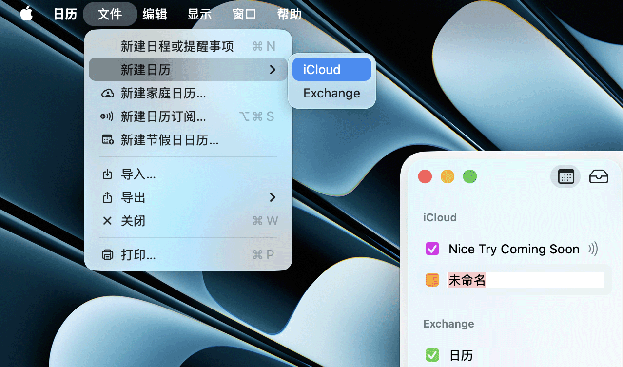 在创建日程前,你首先需要添加一个日历分类。打开「日历」,从菜单栏前往「文件 > 新建日历」。你可以创建不同的日历来为日程分类,并为它们指定不同颜色,以便区分。
