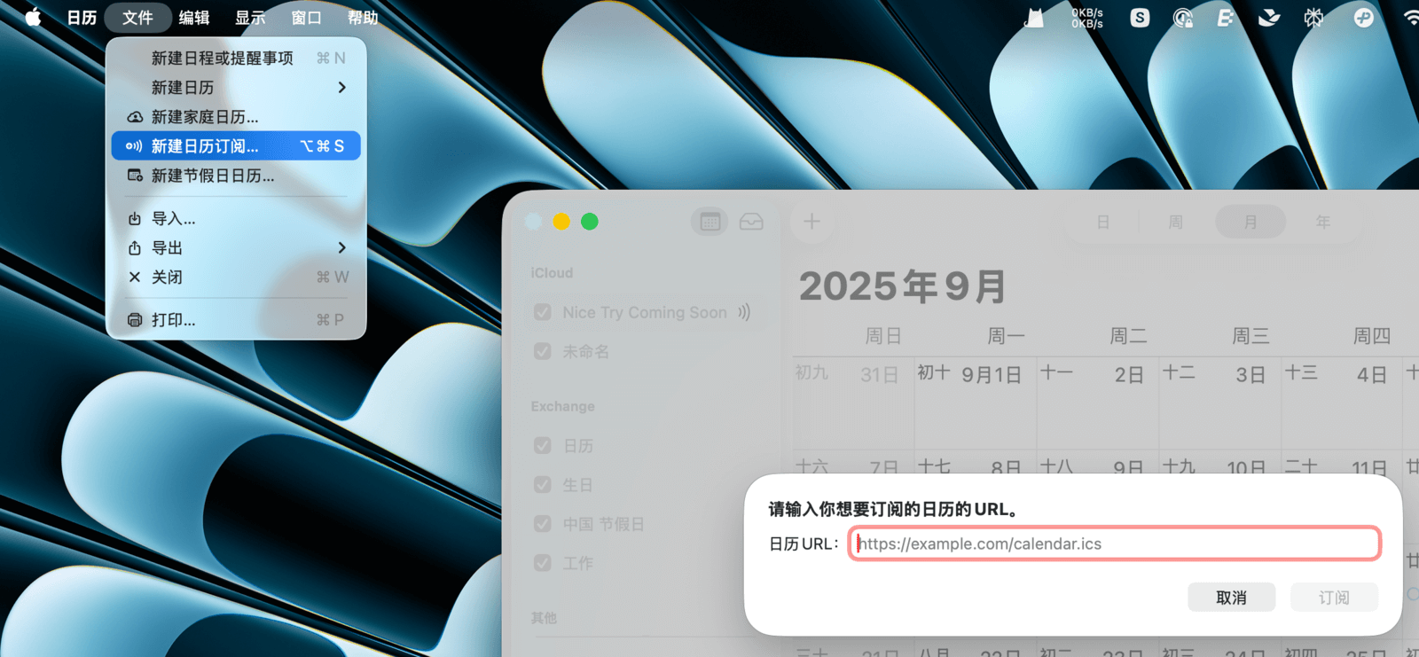 订阅方式很简单:复制日历链接,然后在菜单栏前往「文件 > 新建日历订阅…」并粘贴即可。