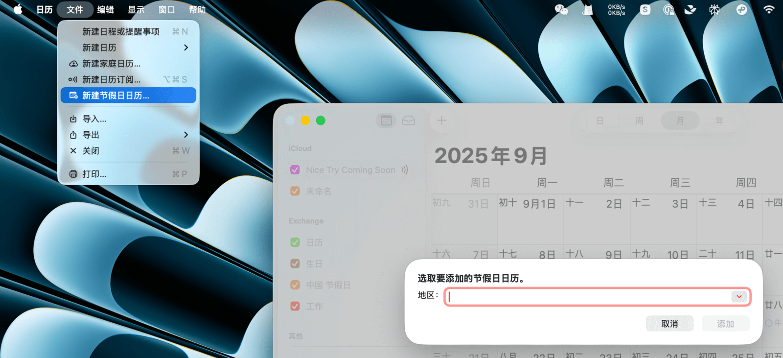 此外,「日历」应用也内置了官方节假日日历。在菜单栏前往「文件 > 新建节假日日历…」,选择你关心的国家或地区即可订阅。