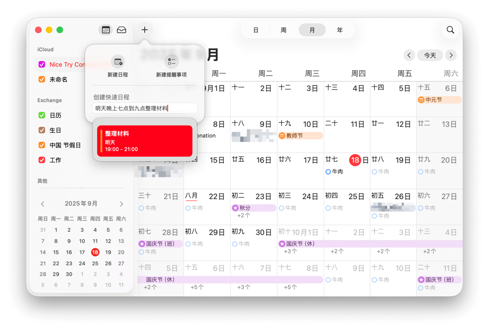 macOS 的「日历」支持通过自然语言快速创建日程。你只需输入「明天晚上七点到九点整理材料」,系统便会自动创建一个标题为「整理材料」、时间为明晚 19:00-21:00 的日程。