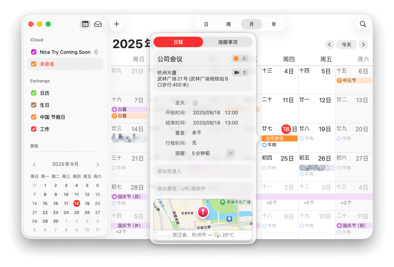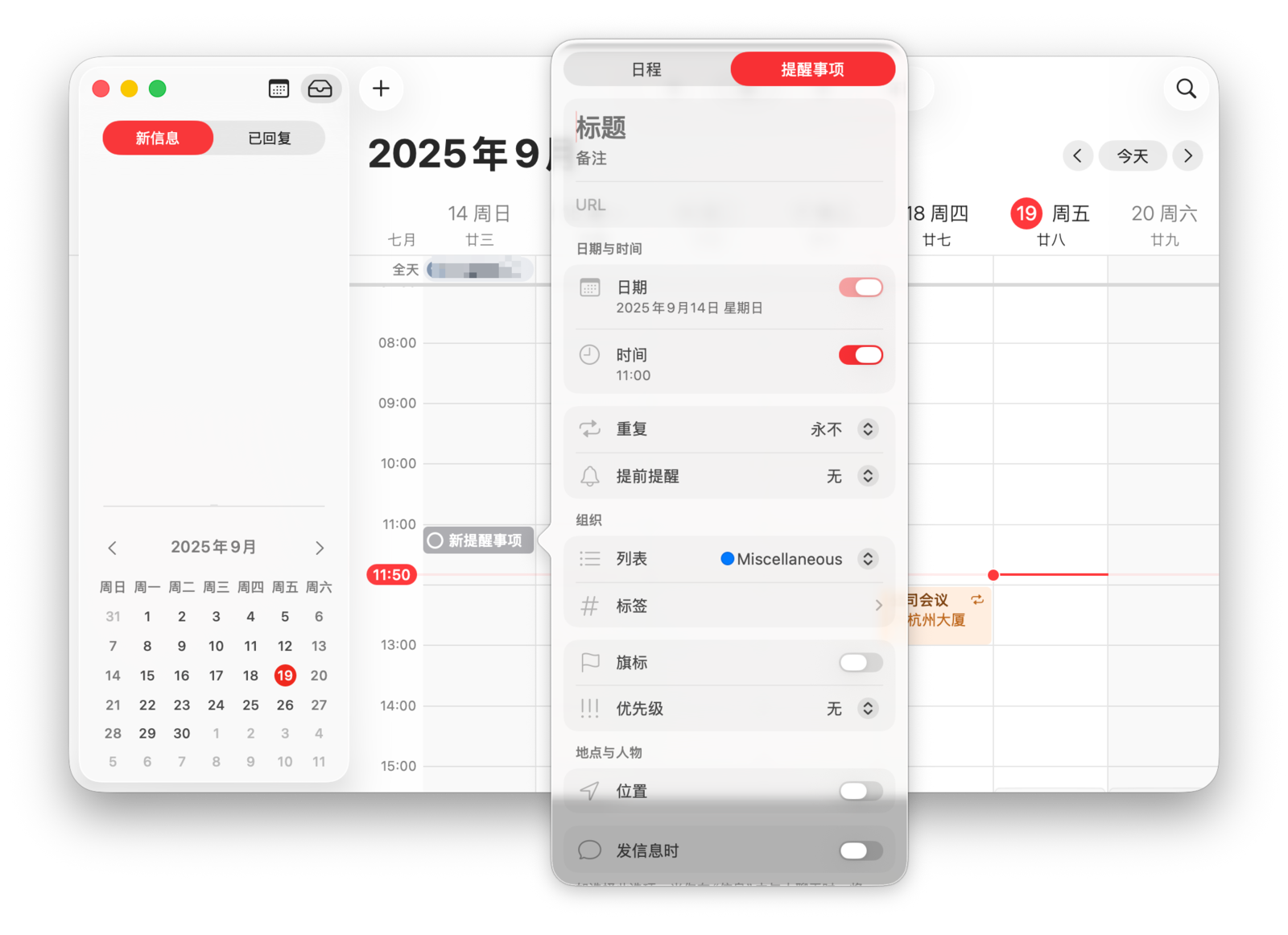 在日历中新建提醒事项的方式与新建日程类似:在空白处双击、右键单击,或点击工具栏的「+」按钮,然后选择建立提醒事项即可。和日程一样,提醒事项也可以通过双击编辑详情,或通过拖拽调整时间。点击事项前的圆圈,可以标记其为完成状态。