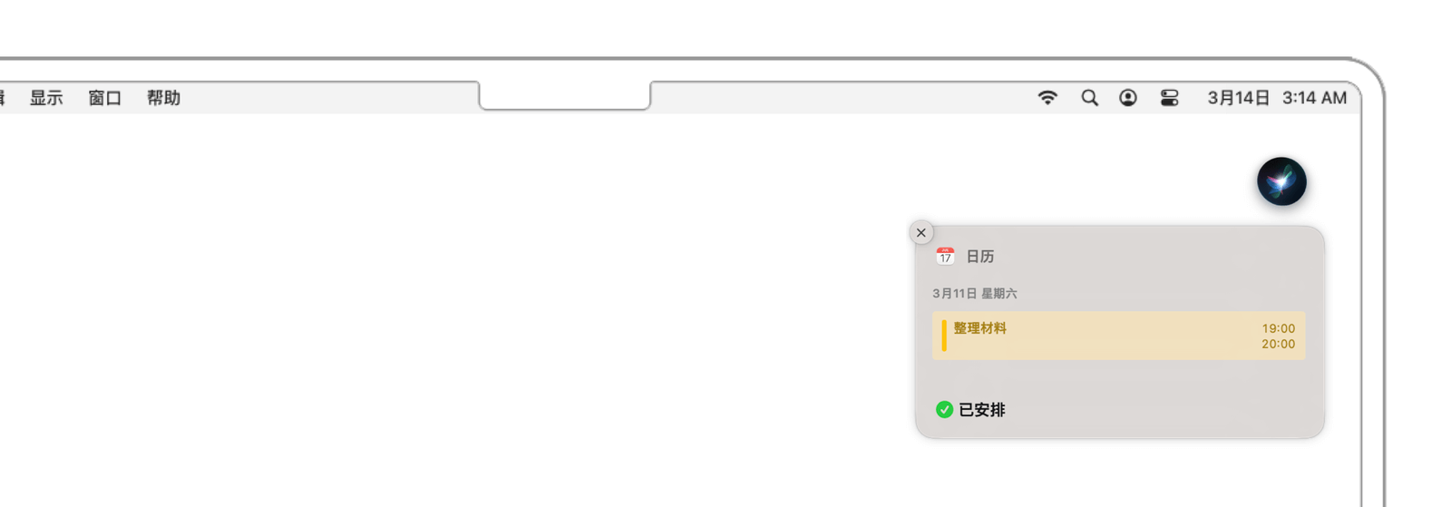 如果你觉得手动输入标题、选择时间等操作有些烦琐,还可以让 Siri 来帮忙。只需用自然语言对 Siri 说出日程信息,例如「明天晚上七到九点整理材料」,它就能帮你快速创建。