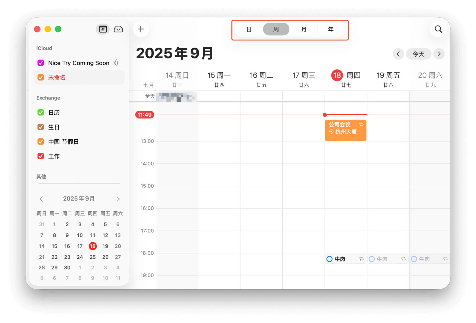 「日历」默认以「周」视图显示。你可以在窗口顶部切换至「日」「月」或「年」视图。无论在哪种视图下,点击「今天」按钮都能快速跳回当前日期。