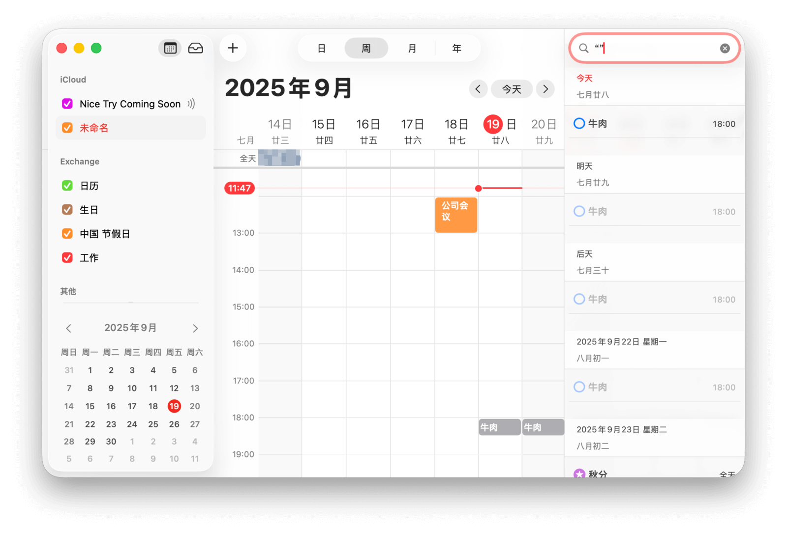 有时,你可能只想按列表查看所有日程。这时,可以在右上角的搜索框中输入一对英文双引号("")并按回车键,所有日程就会按时间顺序列出。