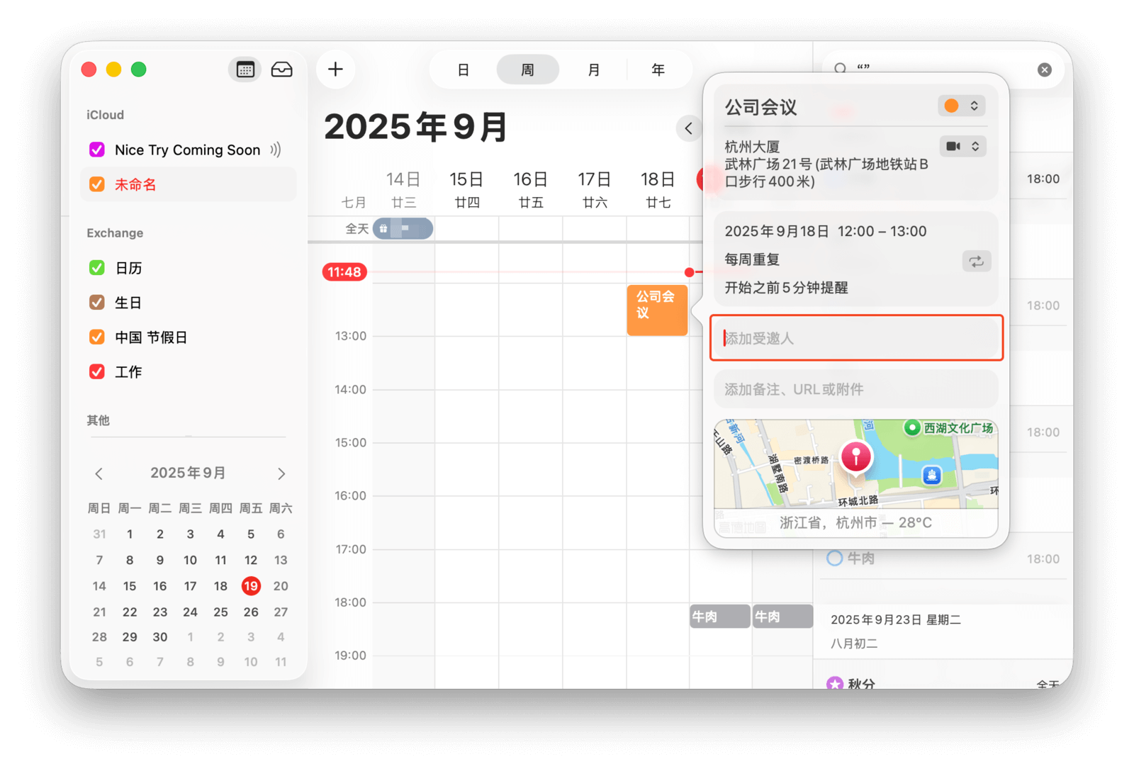 创建日程时,你可以向他人发送邀请,这样该日程也会出现在他们的日历上。