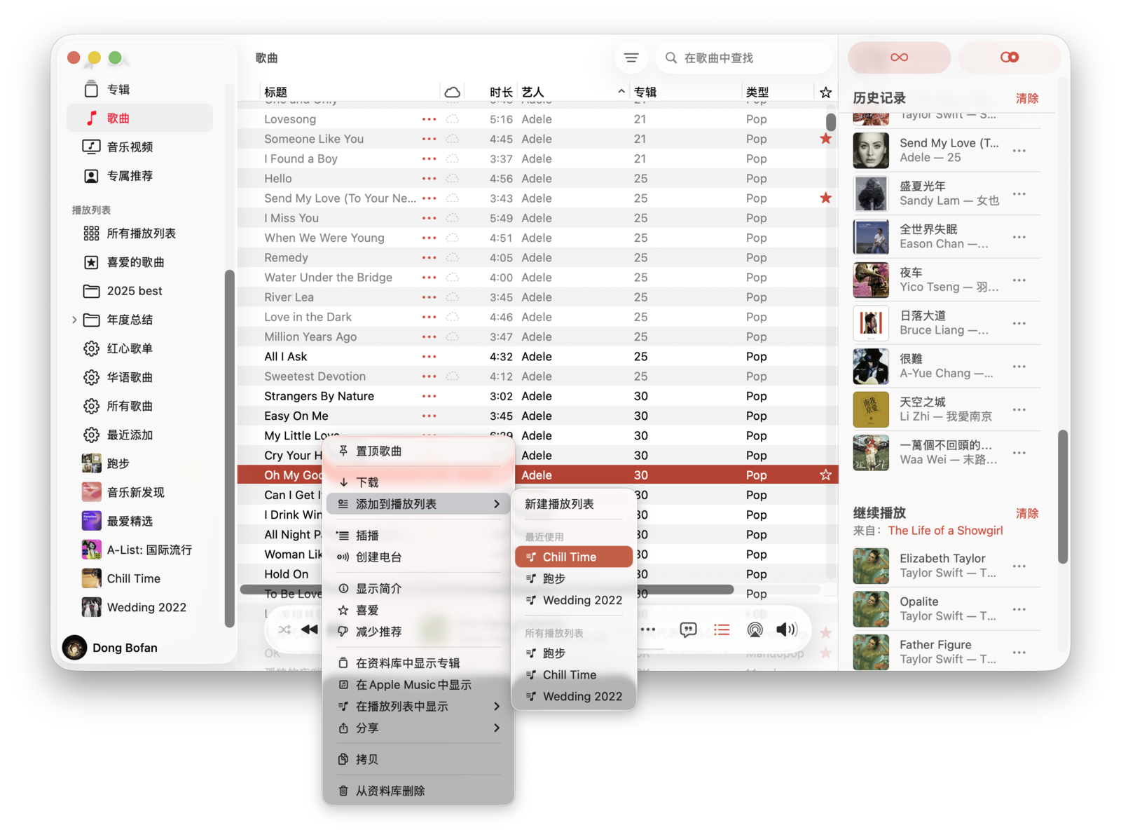 你可以直接将心仪的歌曲或专辑拖入播放列表,也可以在任意界面点击歌曲名称旁边的「...」按钮,然后选择「添加到播放列表」。