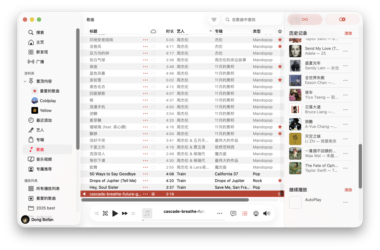 「播放列表」中,包含「待播清单」和「历史记录」。「历史记录」顾名思义,就是你播放过的歌曲;而「待播清单」则显示即将播放的歌曲队列,通常来自当前专辑或歌单。你可以控制播放顺序和模式,还支持「插播」其他歌曲。