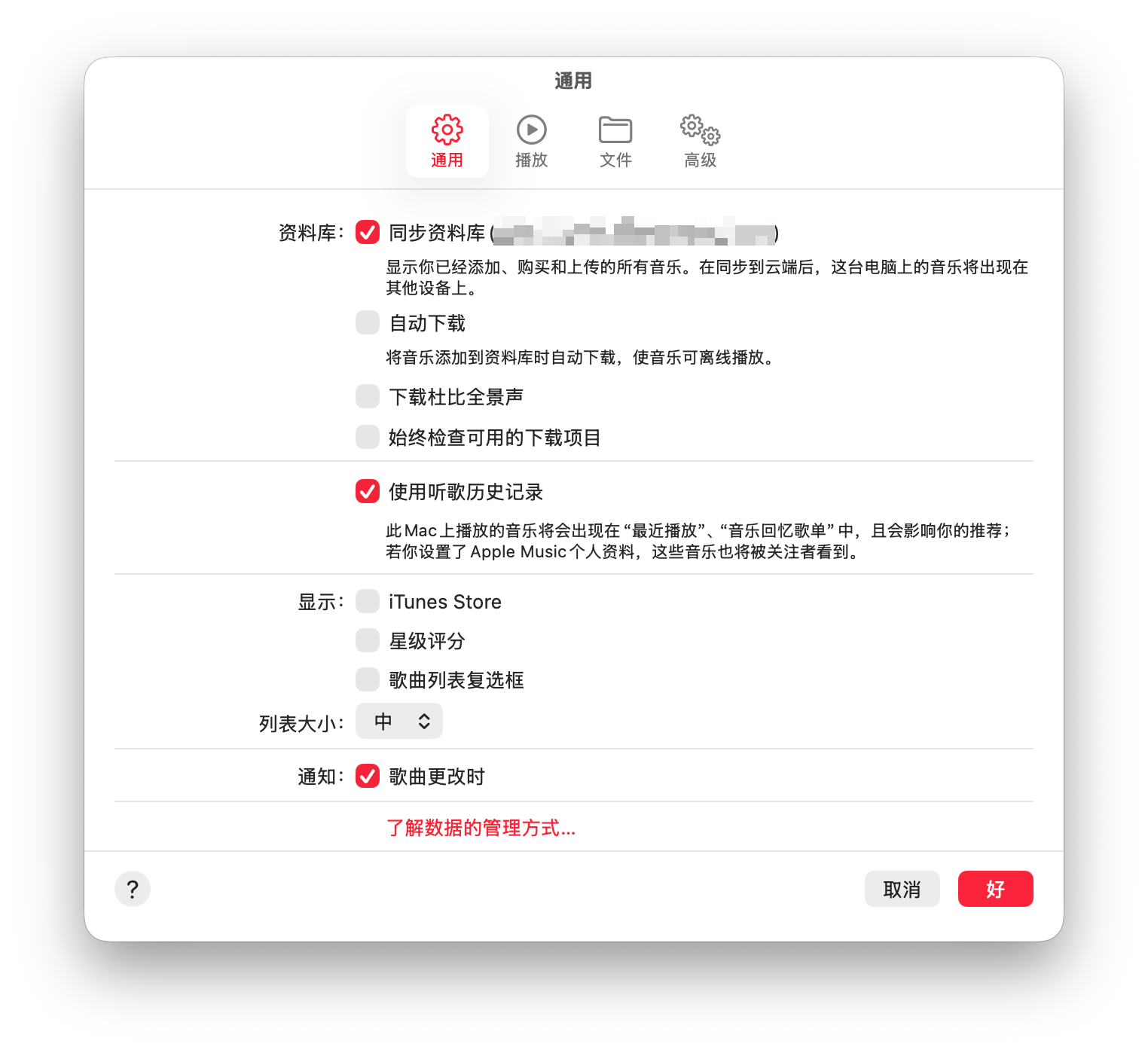 在 Mac 上开启同步:打开「音乐」应用,从屏幕顶部的菜单栏中选择「音乐 > 设置...」,进入「通用」并勾选「同步资料库」。