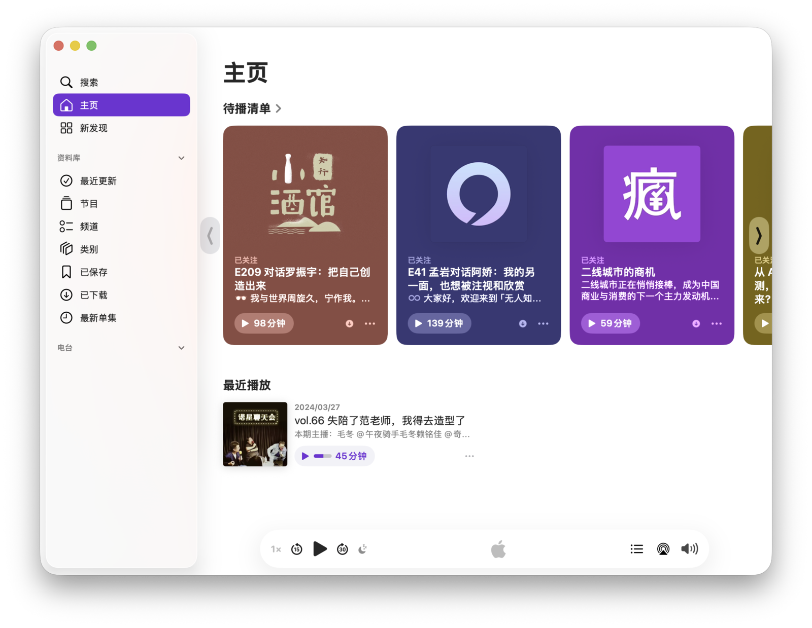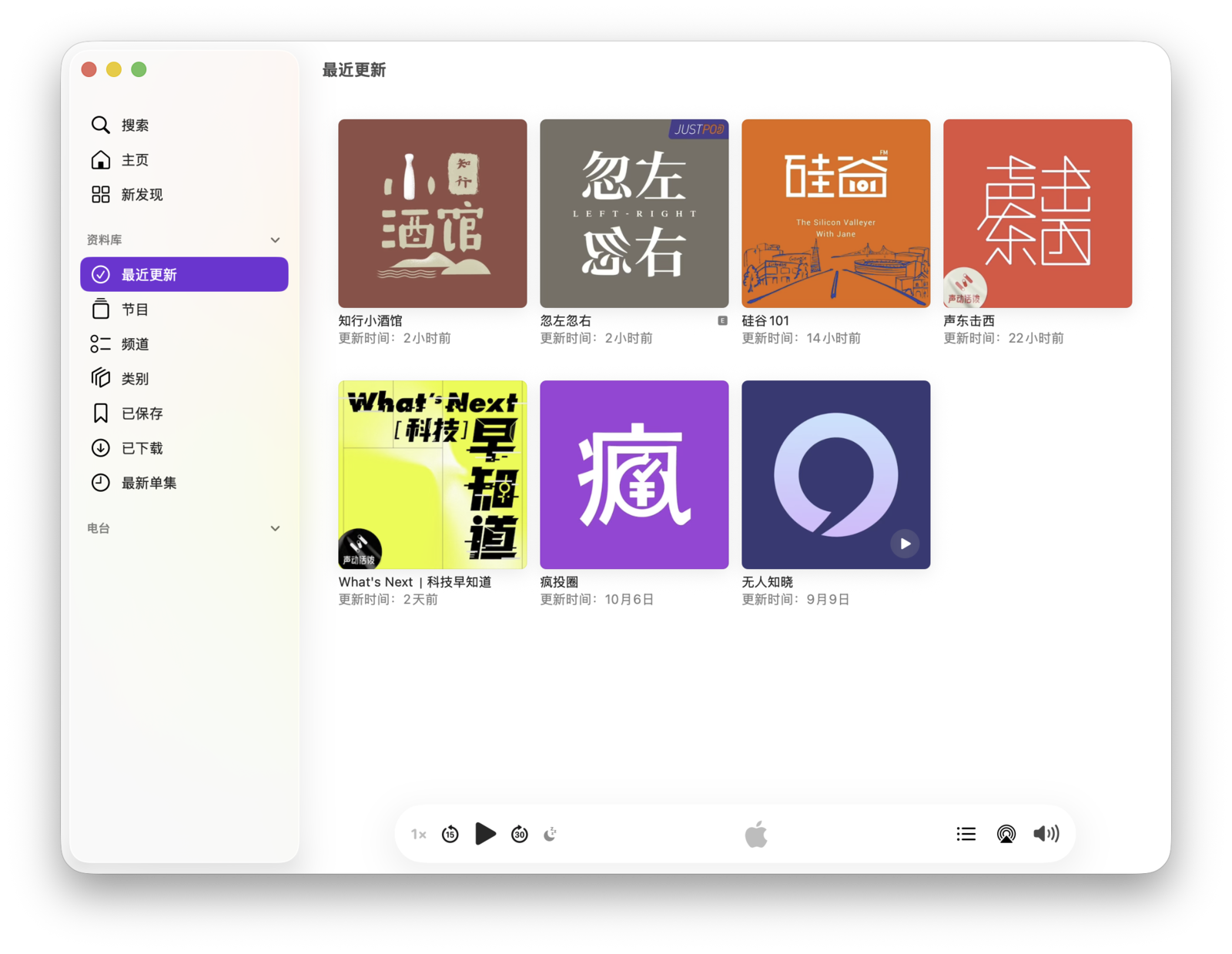 要查看已关注播客的最新单集,可以前往「播客」App 侧边栏的「资料库」面板,并点击「最近更新」。
