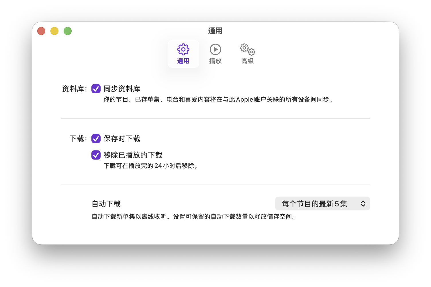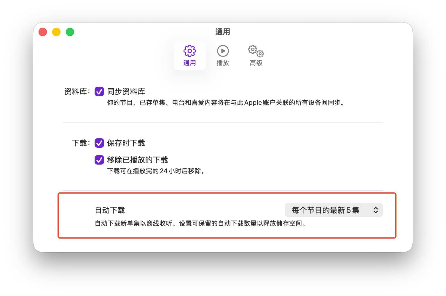 如果想在关注后自动下载该节目的新单集,可以前往菜单栏的「设置 > 通用」,在「自动下载」处选择「每个节目的最新单集」或「过去 30 天」等不同选项。