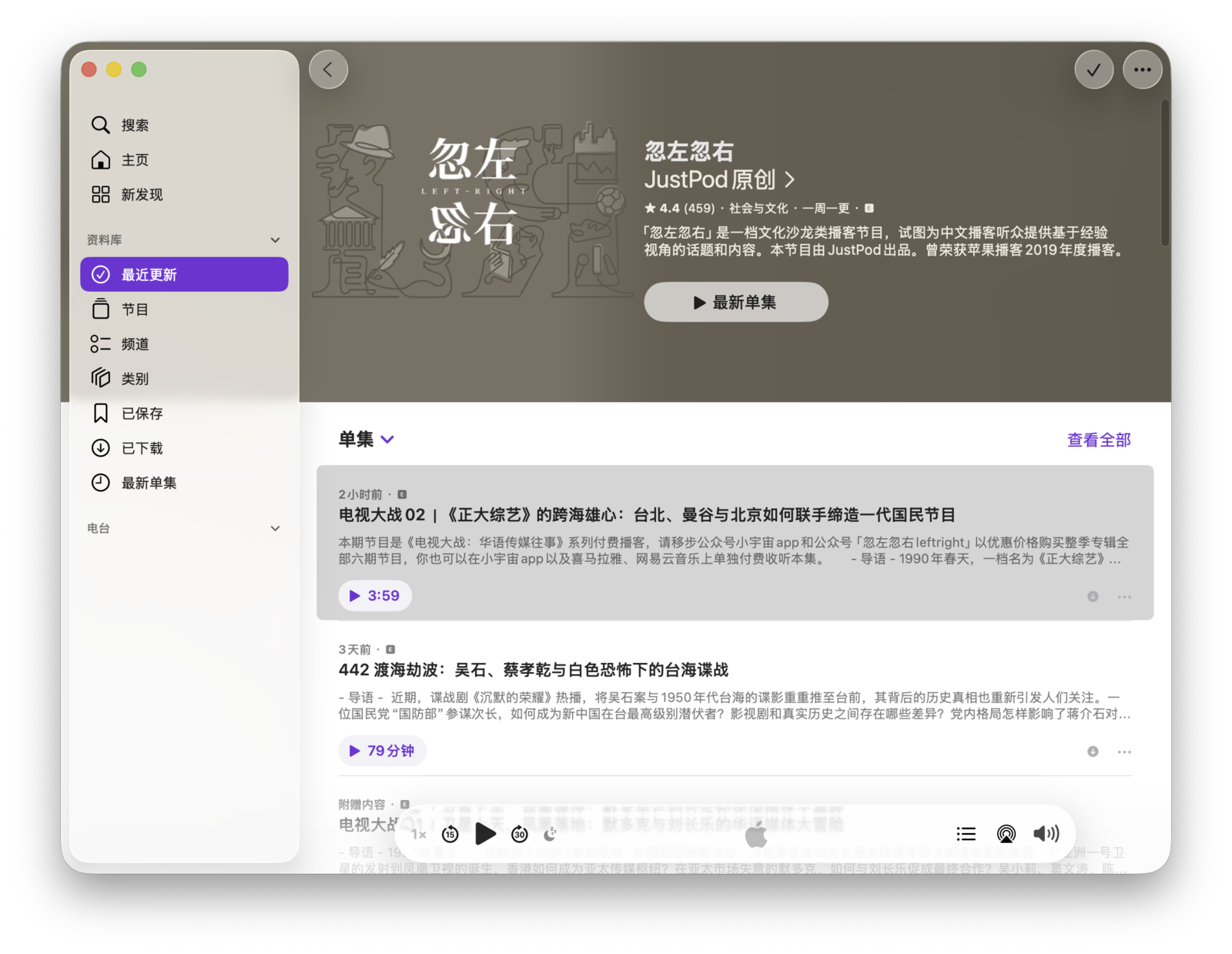 点击一个单集即可进入其介绍页面。要直接播放该单集,可以点击播放键。在单集介绍页面,可以看到由节目制作者提供的补充文字,其中可能包含链接和其他多媒体内容,这部分通常被称为「Shownotes」。