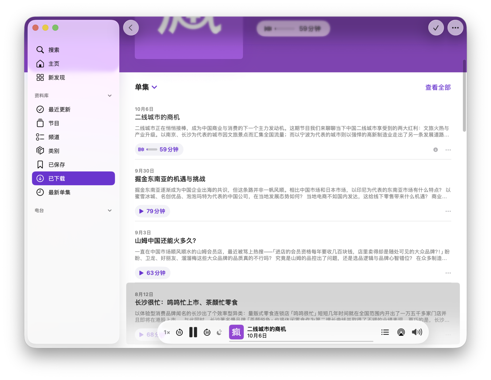 要查看已下载的单集,可以前往「播客」App 侧边栏的「资料库」面板,并点击「已下载」。