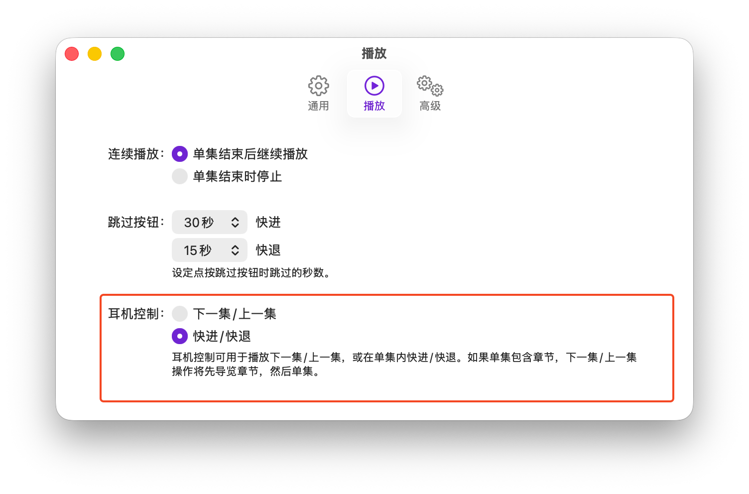 如果你的 Mac 连接了耳机等外部设备,按下设备上的「上一曲」或「下一曲」按钮也可以控制播客播放。要设定此时是切换单集还是快进/快退,可以前往「设置 > 播放」,在「耳机控制」一节中更改设定。