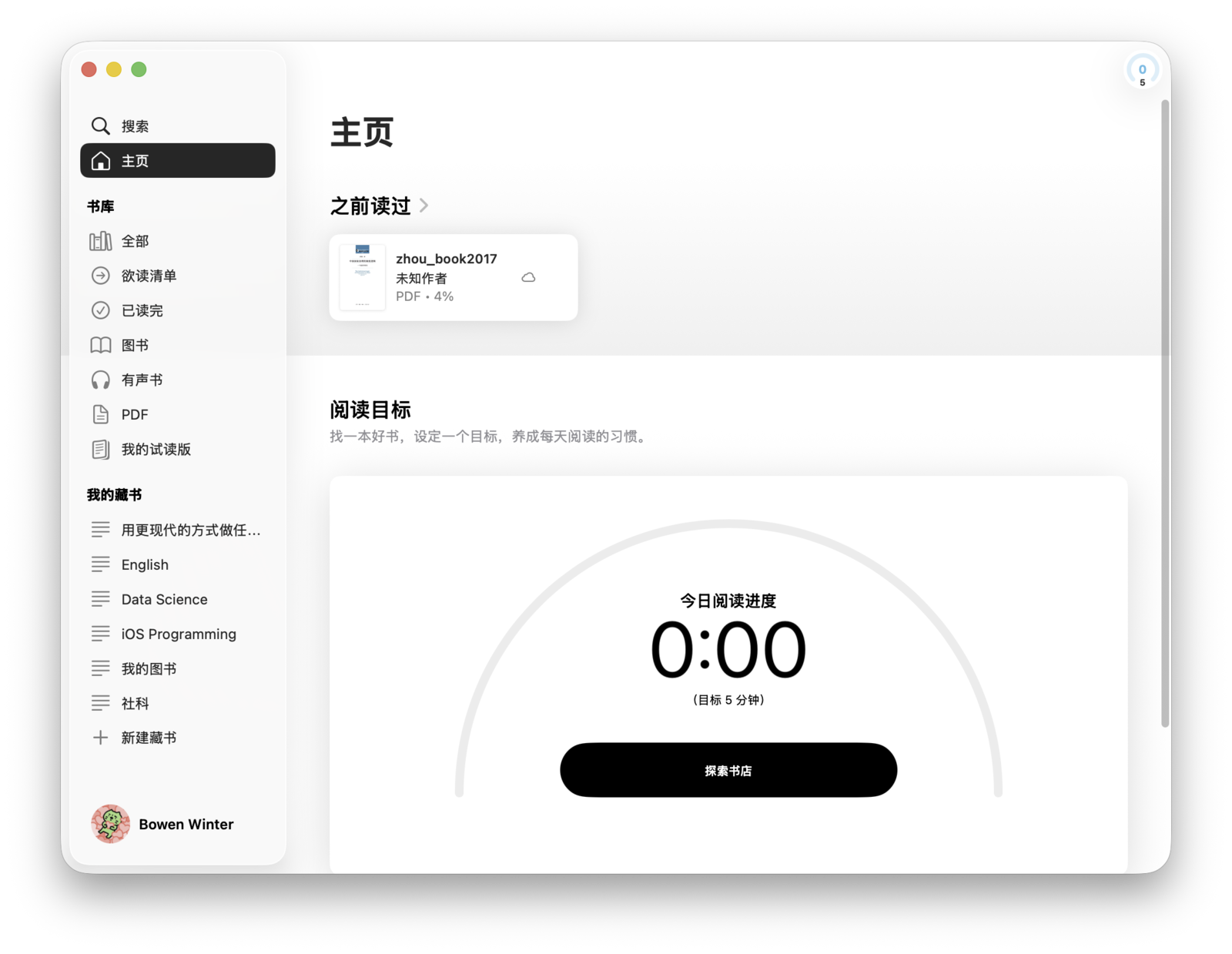 「立即阅读」标签页主要会显示你正在阅读以及最近打开的图书。此外,阅读目标(默认是每天 30 分钟、一年 20 本书)也会显示在此。你可以在这里调整阅读目标、查看进度,这能帮你更有目标地完成阅读计划。如果你使用的是非中国大陆地区的 Apple ID,该标签页下还能看到图书和有声书商店。