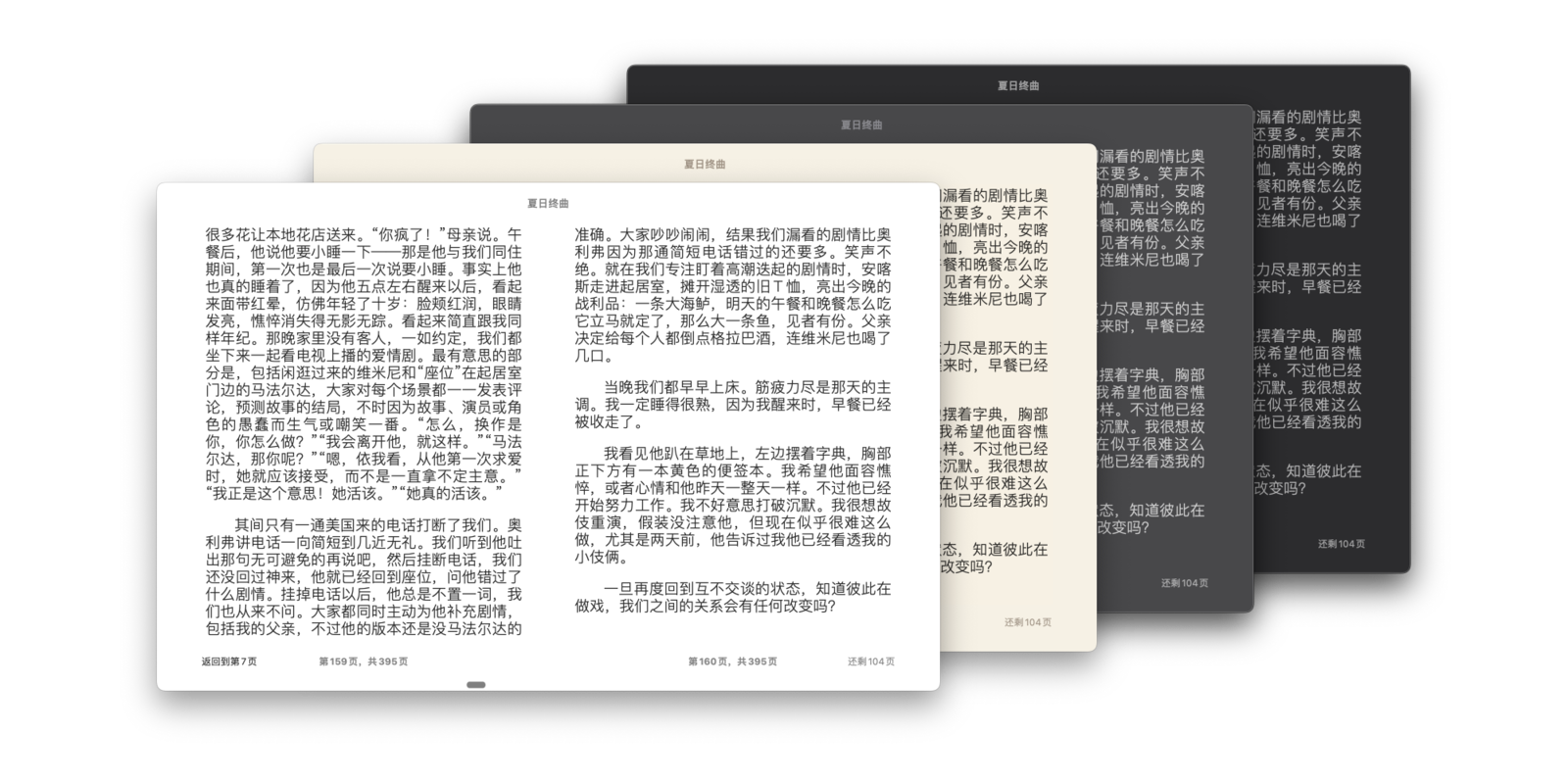 书籍的主题有 4 款可供选择:白色、黄色、灰色和黑色。主题需要手动切换,不会随系统深色模式的切换而改变。