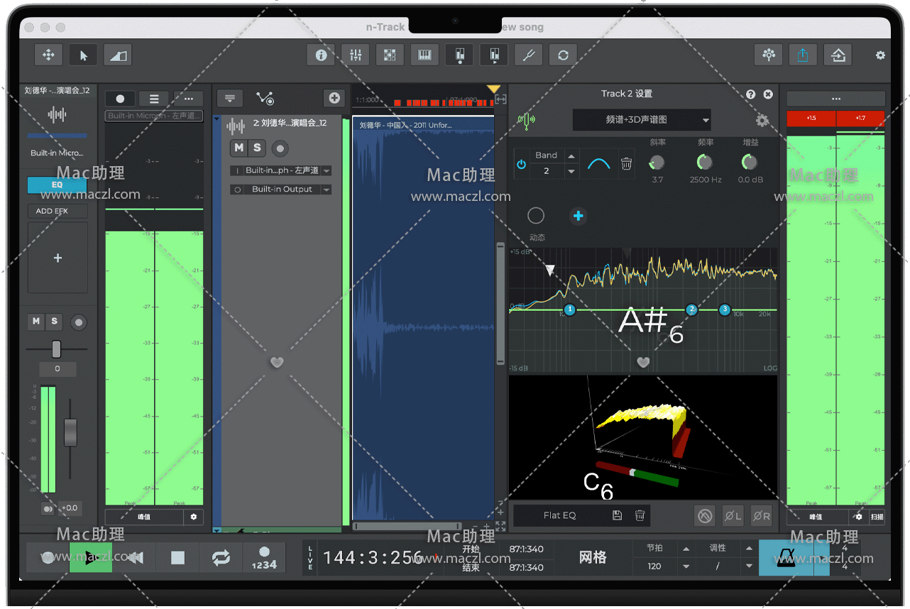 其他功能包括高级均衡和频谱可视化、2D 和 3D 声谱图、立体声场分析器和内置乐器调音器。通过清晰地查看声音的频率成分,您可以更好地控制声音的动态变化。