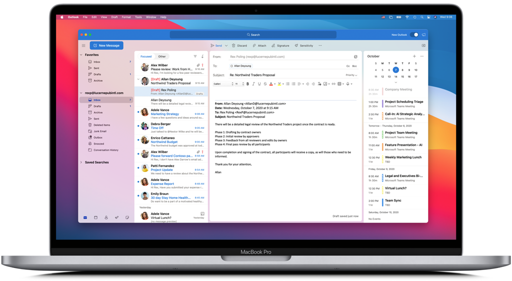 Microsoft宣布,从今天开始,发布许多Microsoft Office for Mac应用程序的新版本,这些应用程序在M1 Mac上本机运行。这意味着现在微软的核心旗舰Office应用程序Outlook、Word、Excel、PowerPoint、OneNote和Microsoft Remote Desktop将运行得更快,并充分利用新Mac上的性能改进,让您在最新的MacBook Air、13英寸MacBook Pro和Mac mini上更加高效。这些新应用程序是通用的,因此它们将继续在配备Intel处理器的Mac上运行。这些应用程序不仅速度快,而且看起来也很棒,因为它们已经过重新设计,以匹配macOS Big Sur的新外观。以下是新款13英寸MacBook Pro的Outlook概览。