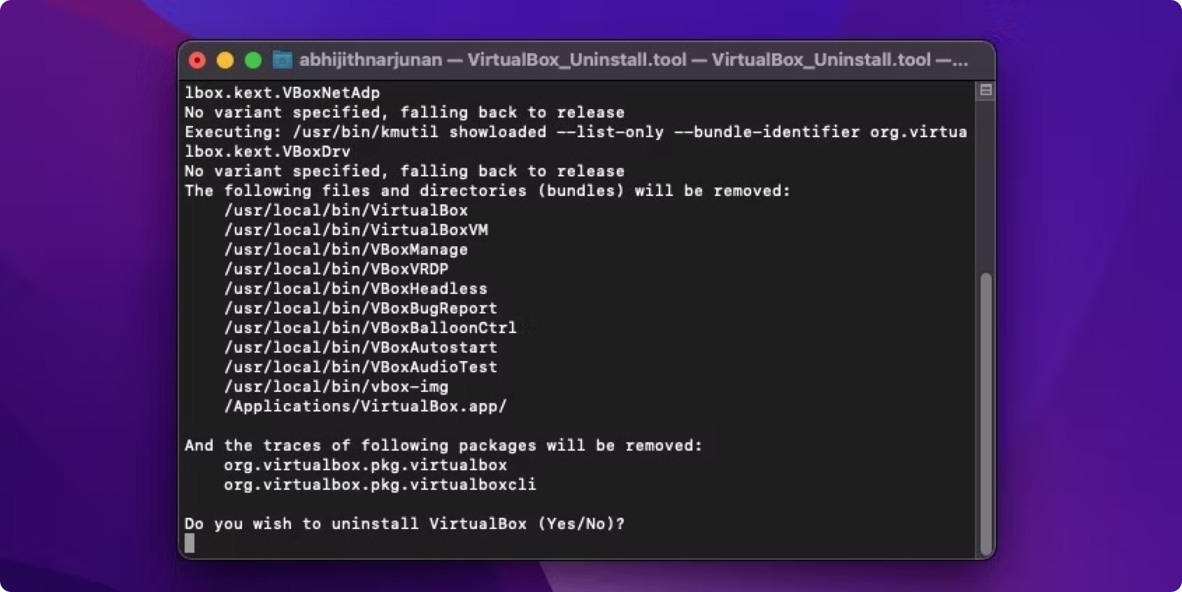 5. 正如您在终端窗口上看到的,卸载程序实用程序将从多个目录中删除VirtualBox应用程序和相关文件。